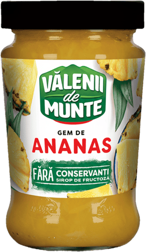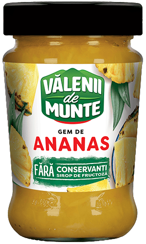 Gemul de ananas Valenii de Munte aduce o notă tropicală și exotică în orice moment al anului. Preparat fără conservanți și fără sirop de fructoză, acest gem păstrează aroma naturală a ananasului.