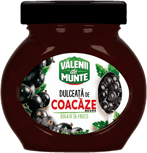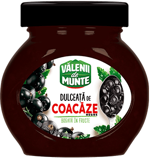 Dulceața Valenii de Munte cu coacăze negre oferă un gust tonic și ușor acrișor, datorită rețetei bogate în fructe. Pentru fiecare 100g de produs sunt folosite 60g de fructe, garantând o aromă intensă.