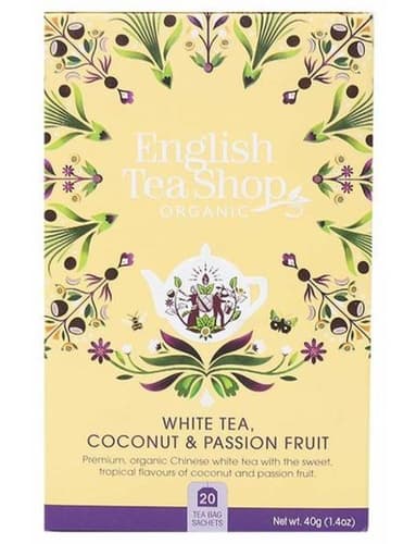 English Tea Shop - Ceai BIO - ceai alb, cocos si fructul pasiunii - 40g - 20 plicuri / produs in Sri Lanka.Un ceai BIO, premium, cu baza de ceai alb, lemongrass si ghimbir, cu arome dulci, tropicale, de cocos si fructul pasiunii. Ceaiul alb este unul dintre cele mai fine sortimente de ceai și este obținut prin procesarea mugurilor și frunzelor de ceai tinere. Un ceai cu gust surprinzator. Toate ingredientele provin din agricutura organica.