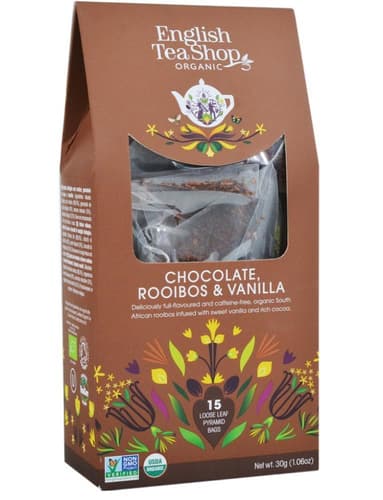 English Tea Shop - Ceai BIO - ciocolata, rooibos si vanilie - 30g - 15 piramide / produs in Sri Lanka.Un ceai BIO, premium, cu baza de ceai rooibos din Africa de Sud, infuzat cu bucati de cacao si vanilie, cu un gust echilibrat, bogat, delicios. Un ceai FARA CAFEINA. Toate ingredientele provin din agricutura organica.
