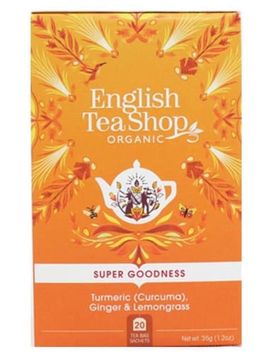 English Tea Shop - Ceai BIO - super goodness - ceai cu turmeric (curcuma), ghimbir si lemongrass - 35g - 20 plicuri / produs in Sri Lanka.Un ceai BIO, premium, cu baza de ghimbir, turmeric (curcuma), lemongrass, la care s-au adaugat lemn dulce, cuisoare, coji de lamaie, cardamom, piper negru si seminte de chimion. Un ceai cu gust surprinzator. Atentie contine lemn dulce - a se evita consumul excesiv de catre persoanele care sufera de hipertensiune. Toate ingredientele provin din agricutura organica