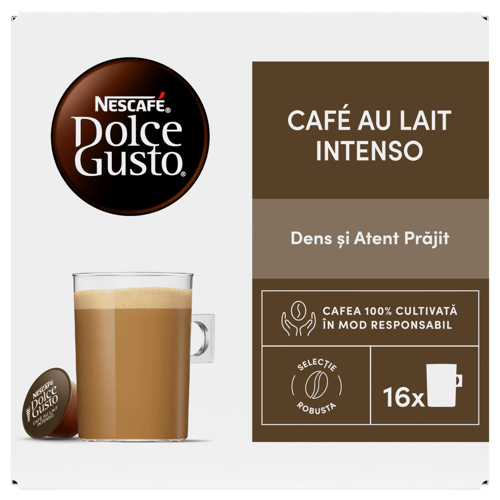 Selectie de cafea Robusta; Descopera NESCAFÉ Dolce Gusto Café au Lait Intenso, un amestec indraznet de cafea Robusta, echilibrat cu o cantitate potrivita de lapte., Descopera NESCAFÉ Dolce Gusto Café au Lait Intenso, un amestec indraznet de cafea Robusta, echilibrat cu o cantitate potrivita de lapte. Suficient pentru a domoli notele amare si a da finete. Si totodata nu foarte mult pentru a proteja caracterul cafelei si a permite distingerea notelor boabelor prajite. Café au Lait Intenso - un amestec îndrăzneț, plin de rafinament, o cafea intensă și cremoasă, preparată dintr-o singură capsulă.