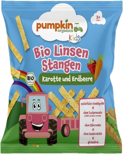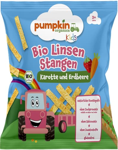 Sticksurile Pumpkin Organics ECO din linte cu morcov și căpșuni sunt o gustare delicioasă și sănătoasă, potrivită pentru copii de peste 3 ani. Produsul este realizat din ingrediente ecologice, fără gluten, fără zahăr sau sare adăugată, fiind o sursă naturală de proteine.