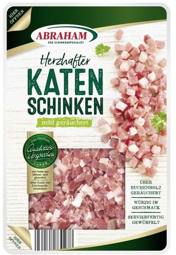 Jambonul cuburi ABRAHAM este o specialitate germană din pulpă de porc crud-uscată și afumată, tăiată în cuburi. Ideal pentru a adăuga savoare salatelor, pastelor, omletelor, gratinurilor sau quiche-urilor.