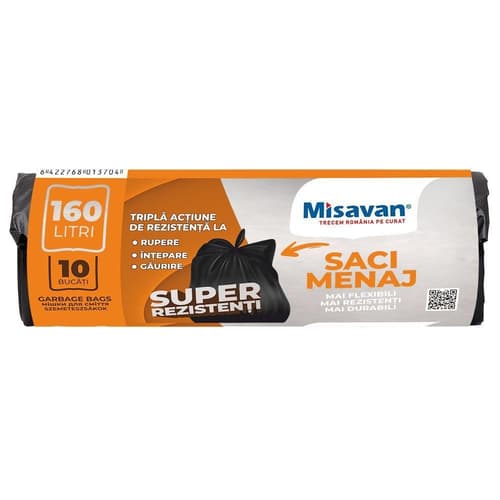 Sacii menajeri Misavan Super Rezistenti sunt realizați dintr-un material durabil, ideal pentru gestionarea resturilor menajere grele. Aceștia oferă o soluție sigură, fără riscul de rupere sau deteriorare.