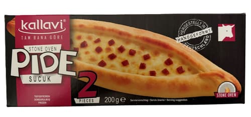 Descoperă gustul autentic al KALLAVI Pide Sucuk, o specialitate congelată delicioasă, preparată cu cârnați savuroși. Acest produs de origine germană este ambalat convenabil în două porții de câte 100g, totalizând 200g, ideal pentru o masă rapidă și gustoasă. Perfect pentru a fi copt direct din congelator, aducând o notă mediteraneană în bucătăria ta.