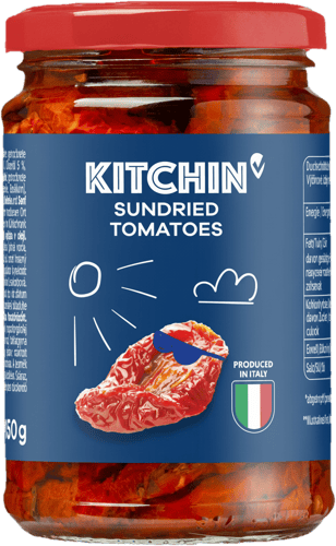 48% rosii uscate rehidratate (apa, 23% rosii uscate la soare), 42% ulei de floarea-soarelui, 5% ulei de masline, 2% capere, sare, otet de vin (contine sulfiti), usturoi (contine sulfiti), pudra de ardei iute, regulator de aciditate: E270 - acid lactic; menta uscata, patrunjel uscat, busuioc uscat, antioxidant: E300 - acid ascorbic.