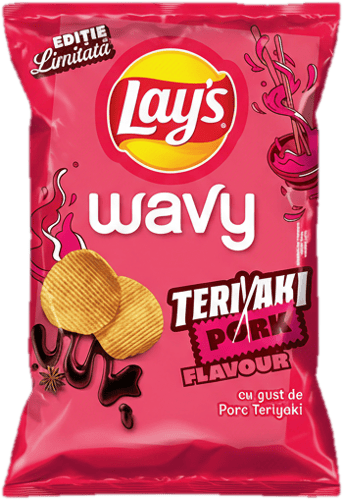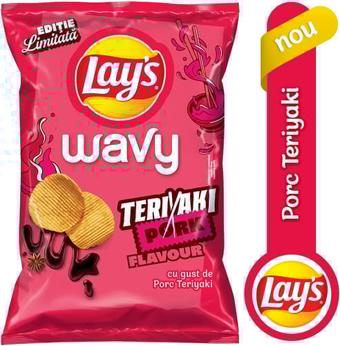 Deschide Lay's. Savureaza fiecare zi! Lay's Wavy. Chipsuri ondulate, din cartofi atent selectionati, cu porc teriyaki. Atat de crocante si delicioase!