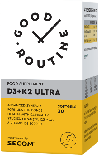 Formula sinergica ce asociaza MenaQ7® ce contine vitamina K2 125 mcg, forma trans, bioactiva, (MK-7) din sursa naturala (Natto – din soia fermentata), vitamina D3 5000 UI din sursa naturala (lanolina din lâna de oaie), pentru mentinerea sanatatii sistemului osos si vitamina E care ajuta la protejarea celulelor împotriva stresului oxidativ.