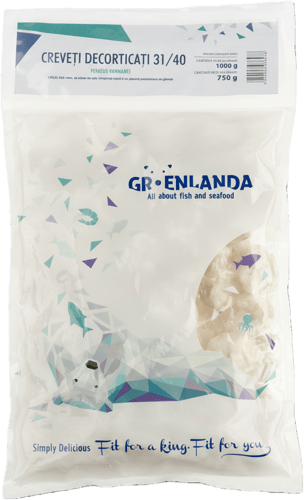 Creveți Vannamei cruzi, decorticați, eviscerați, fără cap, fără coadă, calibrul 31/40 (66-88 buc per punga). Produs congelat rapid și cu glazură protectoare de gheață