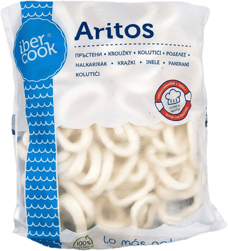 Calamar (MOLUȘTE), amidon, apă, zahăr, sare, agenți de îngroșare (E461, E407, E415), ulei de floarea soarelui, stabilizator (E452).