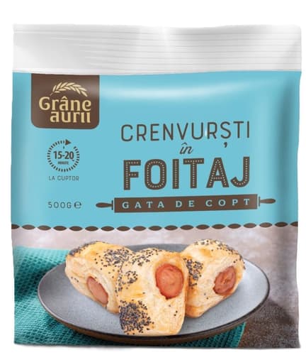 Grane Aurii Crenvurști în foitaj sunt produse de patiserie congelate, realizate din aluat foitaj și crenvurști, decorate cu semințe de mac. Gustul și mirosul sunt specifice ingredientelor folosite.