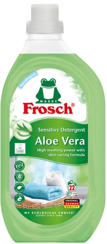 Detergentul lichid sensitive pentru rufe cu aloe vera Frosch Eco este potrivit pentru spalarea tuturor textilelor, cu exceptia lanii si a matasei. Formula cu extracte de aloe vera curata usor la temperaturi de la 20° la 60° C si lasa rufele moi, curate si placut parfumate. Protectia speciala a culorii textilelor pe termen lung asigura faptul ca rufele nu se decoloreaza, culorile nu ies in timpul spalarii si isi pastreaza un aspect proaspat chiar si dupa mai multe spalari. Detergentul sensibil hipoalergenic nu contine coloranti sau conservanti. Mirosul sau delicat reduce riscul de iritare a pielii. Compatibilitate foarte buna cu pielea a fost confirmata prin teste dermatologice. Datorita extractului natural de Aloe Vera, detergentul de vase ecologic Frosch ingrijeste pielea in timpul spalarii vaselor, indepartand totodata eficient urmele de grasime si alte alimente. PH neutru, testat dermatologic.