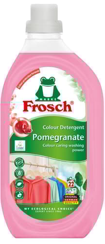 Frosch Eco liquid detergent for colored textiles with pomegranate is suitable for all fabrics, with the exception of wool and silk. The formula with pomegranate extract gently cleans fabrics at temperatures from 20° to 60° C and leaves laundry soft, clean, and pleasantly scented. Special long-term textile color protection ensures that laundry does not fade, colors do not run during washing, and maintain a fresh appearance even after multiple washes. The detergent does not contain preservatives. Very good skin compatibility has been confirmed by dermatological tests. High efficiency in washing clothes, while protecting the skin and the color of fabrics due to the properties of the pomegranate fruit. Used between 20 degrees Celsius and 95 degrees Celsius, it can be used for any fabrics, with the exception of wool and silk. pH neutral, dermatologically tested.