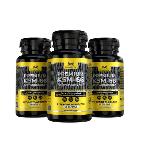 KSM-66® Extract de radacina de Ashwagandha - 600mg/capsula, withanolide 5%, bisglicinat de magneziu, sulfat de zinc heptahidrat, vitamina B6/clorhidrat de piridoxina.