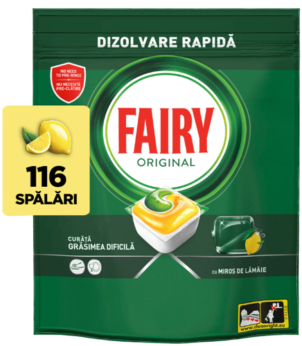 Introduceți o tabletă în compartimentul dedicat al mașinii de spălat vase. Urmați instrucțiunile mașinii pentru cele mai bune rezultate.