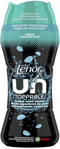 Descoperiti perlele parfumate Lenor Unstoppables Fresh ce se activeaza la spalare, formulate cu tehnologie de prospetime de lunga durata, pentru a oferi rufelor un plus de prospetime continua timp de pâna la 12 saptamâni, în conditii de depozitare. Expertii în parfumuri Lenor recomanda Unstoppables Fresh daca sunteti în cautarea unui miros revigorant de rufe proaspat spalate pentru mai mult timp. Parfumul Lenor Unstoppables ofera prospetime la fiecare spalare! Ariel recomanda sa-l adaugati la fiecare spalare, pe lânga rutina obisnuita de spalare a hainelor.