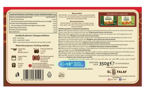 Mini falafelul Original EL FALAF este un produs congelat românesc, micuț, dar plin de savoare autentică, perfect pentru gustări sau pentru a fi împărțit cu prietenii. Ambalat la 350g, acest falafel aduce gustul tradițional într-o versiune convenabilă. Necesită preparare înainte de consum pentru a te bucura de gustul său intens și de textura sa plăcută. O alegere excelentă pentru o masă rapidă și delicioasă.