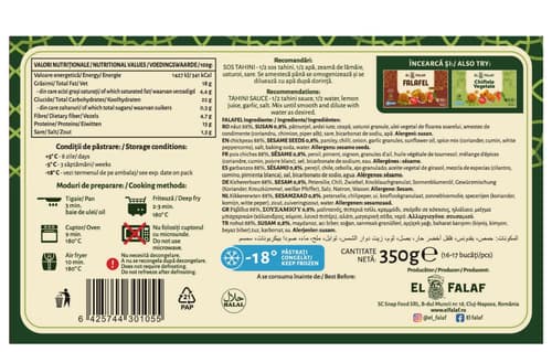 Falafelul EL FALAF cu susan este un produs congelat românesc, ce aduce o textură crocantă și un plus de gust și aromă datorită semințelor aurii de susan. Acest falafel, ambalat la 350g, este perfect pentru a adăuga o notă exotică meselor tale. Necesită preparare înainte de consum, fiind o opțiune delicioasă și rapidă pentru orice moment al zilei. Bucură-te de o experiență culinară autentică, plină de savoare.