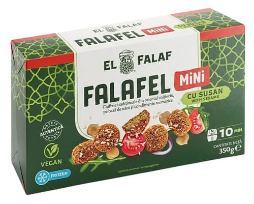 EL FALAF Falafel cu susan Mini. Produs Congelat necesita prepare inainte de consum.Mic, dar gustos, falafelul mini cu susan combină gustul intens al falafelului tradițional cu crocantul semințelor de susan — ideal ca gustare sau pentru evenimente.