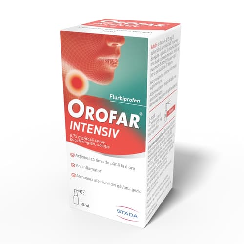 Nu utilizati Orofar Intensiv in cazul in care: sunteti alergic (hipersensibil) la flurbiprofen sau la oricare dintre celelalte componente ale acestui medicament, daca aveti sau ati avut o reactie alergica dupa administrarea medicamentelor antiinflamatoare nesteroidiene (AINS) sau aspirinei (acid acetilsalicilic), astm bronsic, respiratie suieratoare, mancarimi, secretii nazale, eruptii trecatoare pe piele, umflare, daca ati avut vreodata doua sau mai multe episoade de ulcer gastric, ulcere intestinale sau sangerare gastrointestinala, daca ati avut in antecedente colita (inflamatie a intestinului), daca sunteti in ultimele 3 luni de sarcina, daca aveti insuficienta cardiaca, renala sau hepatica severa