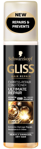 Acest balsam de păr Gliss Ultimate Repair combină keratina lichidă și perle negre pentru a reînnoi pierderile de keratină și a repara intens structura părului.