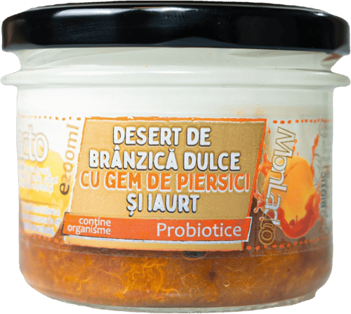România,MONLACTO Desert de brânzică dulce cu gem de piersici și iaurt este un desert la borcan, cu textură consistentă și gust echilibrat între lactat și fructe.