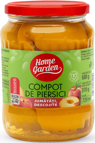 Bulgaria,Home Garden Compot de piersici conține jumătăți de piersici în sirop, cu gust dulce și textură potrivită pentru deserturi. Se consumă simplu sau ca ingredient în rețete.