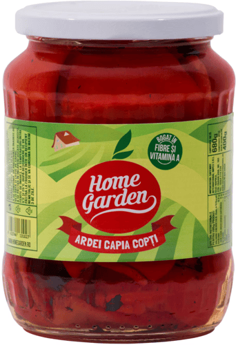 Bulgaria,Ardei Kapia copți Home Garden, conservați în oțet, gata de consum direct din borcan. Textură fragedă și gust echilibrat, potrivite pentru mese rapide.