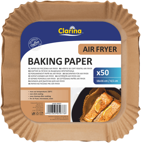 Polonia,Hârtia de copt pătrată Clarina pentru air fryer ajută la gătire cu mai puțină murdărie în aparat. Format 16 × 16 cm, cu înălțime 4,5 cm, potrivit pentru friteuze compacte sau porții mai mici.