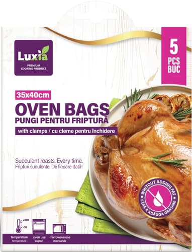 Polonia,Pungile pentru friptură Luxia, 35 × 40 cm, sunt concepute pentru gătirea la cuptor a cărnii și legumelor, ajutând la păstrarea aromei și a suculenței. Setul conține 5 pungi rezistente, fiecare cu clipsuri pentru închidere.