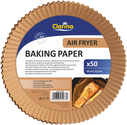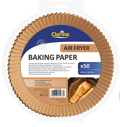 Polonia,Hârtia de copt rotundă Clarina pentru air fryer este concepută pentru preparate gătite cu mai puțin ulei. Formatul de 20 cm diametru și 4,5 cm înălțime se potrivește cu majoritatea friteuzelor cu aer cald.