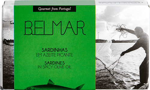 Portugalia,Sardine Belmar pescuite sălbatic, conservate în ulei de măsline cu note picante. Textură fină și gust echilibrat, potrivite pentru mese rapide sau gustări.