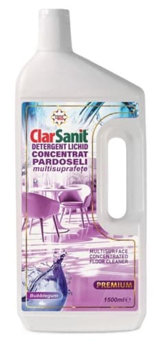 Detergentul de pardoseli Clarsanit premium, un produs românesc, curăță eficient toate tipurile de suprafețe lavabile, de la gresie la parchet laminat. Formula sa acționează rapid împotriva murdăriei și petelor, lăsând o curățenie impecabilă, fără reziduuri sau peliculă alunecoasă. Parfumul plăcut de gumă de mestecat aduce o notă dulce și discretă în încăpere. Ideal pentru utilizarea zilnică, disponibil la 1.5 litri.