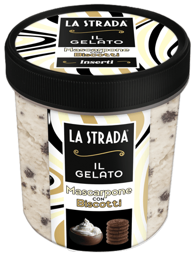 Italia,La Strada il gelato inserti. Inghetata cu branza mascarpone si smantana cu bucati de biscuiti cu cacao