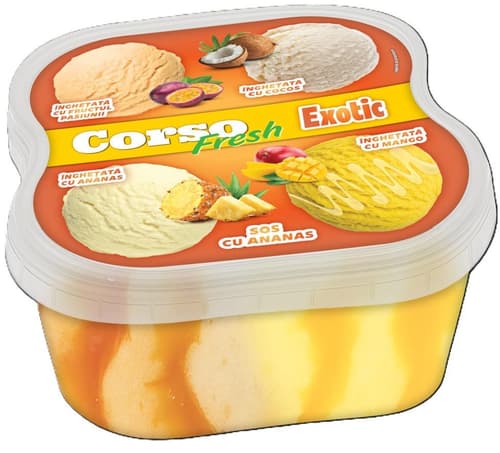 Răcorește-te cu înghețata Corso Fresh Exotic, o explozie de arome tropicale direct din Slovenia! Acest sortiment generos de 1.65 litri combină armonios gustul intens de fructul pasiunii, ananas, mango și cocos, completat de un sos delicios de ananas. Este alegerea perfectă pentru a aduce o notă exotică oricărei ocazii, oferind o experiență gustativă vibrantă și revigorantă.
