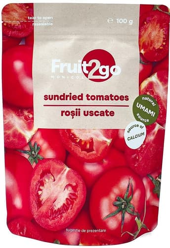 Roșiile uscate la soare Fruit2go sunt o sursă naturală de aromă intensă, bogată în umami, perfectă pentru a completa o varietate de preparate. Aceste roșii gustoase și nutritive sunt o sursă excelentă de fibre, calciu și fier. Provenind din afara UE, acest pachet de 100g este ideal pentru a fi adăugat în salate, paste sau în sosuri și tartinabile pentru un plus de savoare în orice bucătărie.