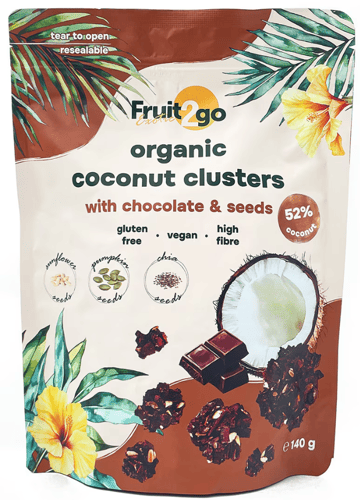 În afara UE,Un amestec savuros de fulgi de cocos tostat si semințe bogate in nutrienți, clusterele BIO din cocos Fruit2go Exotic ofera o gustare natural crocanta si plina de savoare. Bogate in fibre, fara ulei adaugat, fara gluten si fara aditivi, sunt perfecte de savurat ca atare sau ca topping delicios pentru iaurt, terci sau desertul tau preferat.