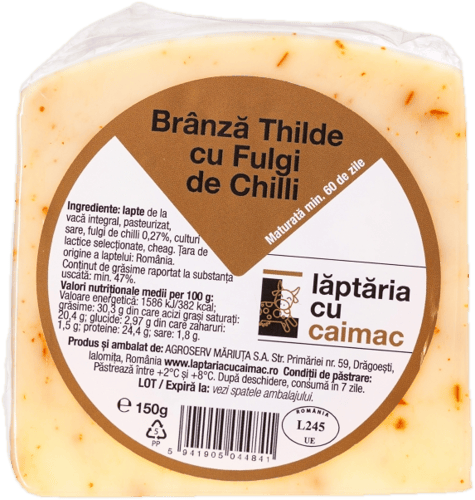 Încearcă brânza maturată Thilde de la Lăptăria cu Caimac, o delicatesă românească cu o personalitate puternică, dată de nota picantă de chili. Această brânză savuroasă, cu o textură bogată, este ideală pentru platouri de brânzeturi sau pentru a adăuga un plus de savoare rețetelor tale preferate. Disponibilă într-un pachet de 150g, este gata să te surprindă cu gustul său intens.