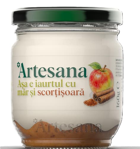 Așa e iaurtul desert cu măr și scorțișoară de la Artizanii laptelui Artesana: din lapte integral, neomogenizat, 100% românesc, pasteurizat la temperatură blândă, cu măr copt și un strop de scorțișoară care aduce aminte de gustul simplu al copilăriei. E cremos, ușor aromat, fără excese, doar echilibrul firesc dintre dulceața fructului și căldura condimentului. Un desert curat, pe care îl poți savura liniștit, când ai poftă de ceva bun, fără compromisuri. Produs nestandardizat - procentul de grăsime poate varia în funcție de grăsimea fiecărui lot de lapte în parte, min. 3,5%. Țara de origine a laptelui: România. Nu conține conservanți sau lapte praf.