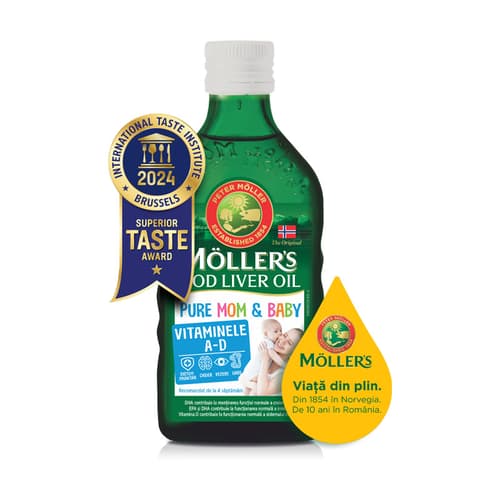 MÖLLER¿s Pure Mom & Baby este recomandat gravidelor, femeilor care alapteaza si mai apoi sugarilor de la 4 saptamani. MÖLLER¿s Pure Mom & Baby furnizeaza aportul zilnic necesar de Omega-3 si de vitaminele A si D. Este cea mai pura forma de Omega-3 natural, fara arome, fara conservanti, fara toxine si impuritati.
