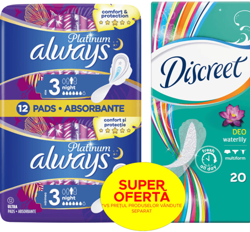 Always Duo include absorbante periodice mărimea 3 și Discreet deo absorbante zilnice, pentru utilizare în funcție de momentul zilei. Setul este conceput pentru confort și protecție în rutina zilnică.