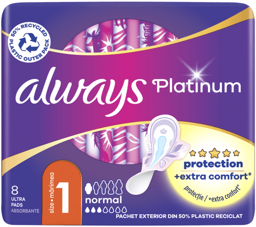 Always Platinum Normal, mărimea 1, sunt absorbante periodice pentru protecție zilnică în timpul menstruației. Sunt concepute pentru fixare pe lenjerie și pentru reducerea senzației de umezeală.