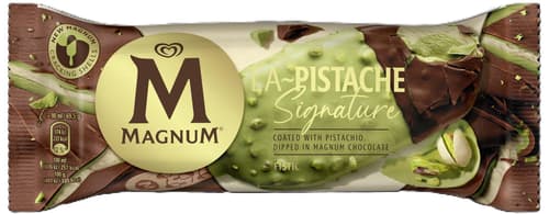 Savurează o înghețată Magnum Fistic, un produs german irezistibil. Acest baton de 90 ml conține înghețată cremoasă cu aromă de fistic și un miez de fistic. Este acoperit generos cu un strat crocant de fistic (27%) cu bucățele de fistic caramelizat (3.5%), finisat cu un vârf decadent de ciocolată cu lapte (5%). O plăcere perfectă pentru iubitorii de fistic.