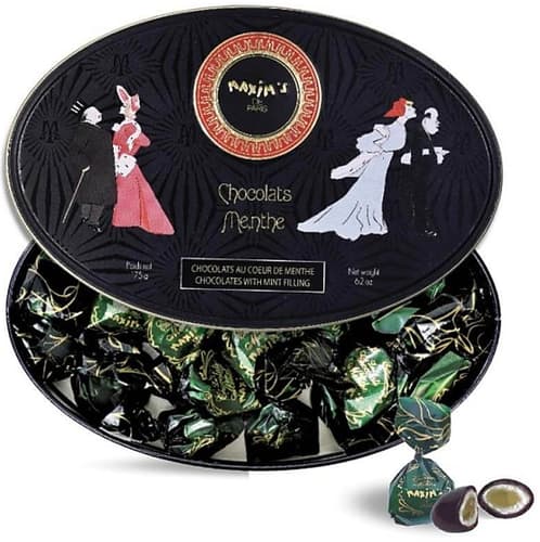 Savurează bomboanele de ciocolată Maxim's de Paris cu cremă de mentă, o delicatesă italiană. Aceste bomboane de ciocolată neagră au un interior fondant de mentă, oferind un gust răcoritor și intens. Sunt ambalate individual pentru prospețime optimă și vin într-o cutie metalică ovală elegantă, inspirată de anii 1920. Perfecte pentru un cadou sau pentru a încheia un moment special, într-un ambalaj de 175 g.
