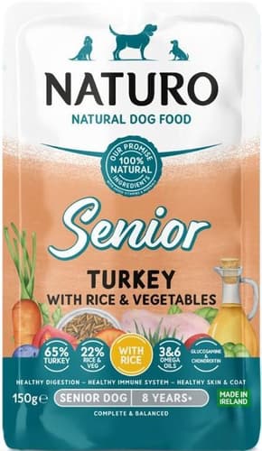 Hrana umedă Naturo Senior cu curcan și orez este o masă completă, hipoalergenică, special creată pentru câinii în vârstă. Produsă în Irlanda, această tavă de 150g conține 100% ingrediente naturale, inclusiv carne de curcan, 15% legume și 15% orez brun pentru o digestie ușoară și energie. Îmbogățită cu glucozamină și condroitină pentru flexibilitatea articulațiilor, plus Omega 3 & 6 pentru o blană sănătoasă, este fără coloranți, arome sau conservanți artificiali.