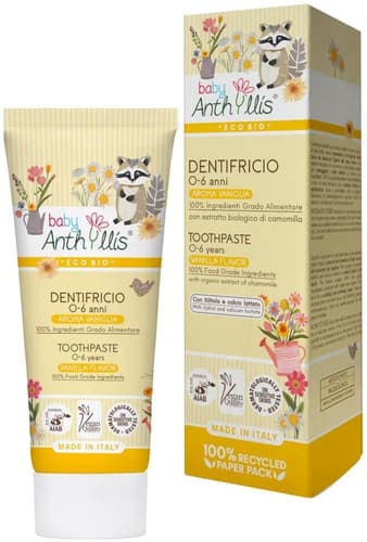 Italia,Pasta de dinți Baby Anthyllis ECO pentru copii 0–6 ani are gust de vanilie și este concepută pentru dinții de lapte, cu indice scăzut de abrazivitate. Ajută la menținerea igienei orale zilnice, într-o formulă delicată.