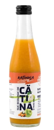 Suc 100% ECOLOGIC presat la rece din suc de mere bio (Malus domestica) 65% si fructe de catina bio (Hippopae rhamnoides L.) 15%, apa. Contine zaharuri prezente in mod natural.
