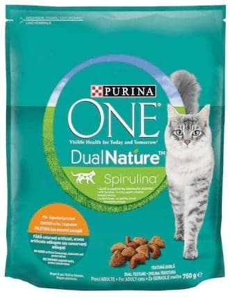 PURINA ONE DualNature for adult cats contains Spirulina in a combination of appetizing textures. The food is 100% complete and balanced, with a rich content of chicken and essential nutrients that your cat will love. Spirulina is a natural ingredient that helps support the immune system. Spirulina is known for its unique nutrients that bring many health benefits to your cat.