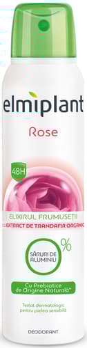 Cu extract de Trandafir 100% Organic, prebiotice de origine naturala, protectie timp de 48 de ore si formula impotriva petelor albe, deodorantul spray Elmiplant Rose asigura protectie invizibila, oferind un parfum revigorant de trandafir, dublat de o nota lemnoasa de mosc. Un elixir al frumusetii pe care il cauta fiecare femeie!